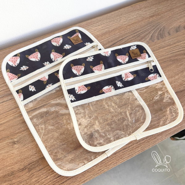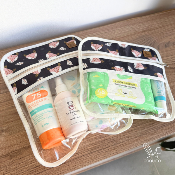 El kit incluye dos bolsitas de hule transparente, con cierre reforzado y las estampas más lindas en sus fuelles.