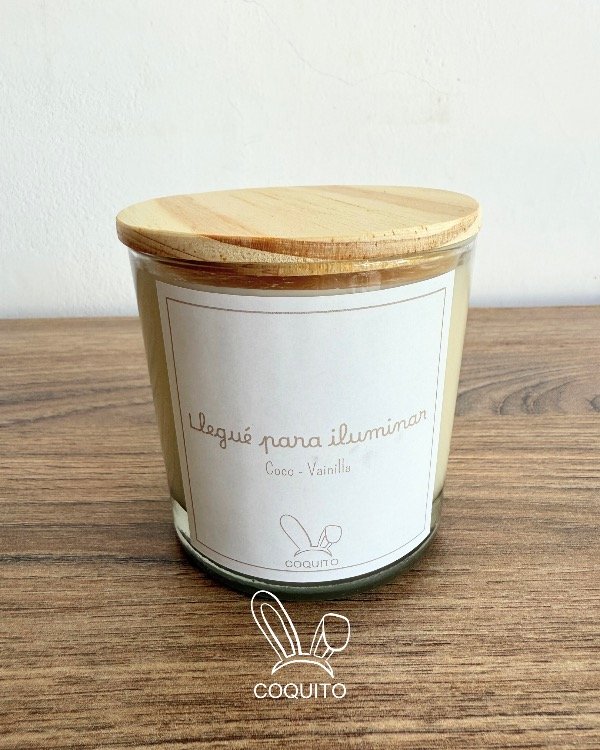 🐰 Vela aromática de soja grande de Coco y Vainilla con etiqueta: "Llegué para iluminar”. Importante: si el envío es a través del correo, la velita dentro de la caja irá envuelta además en papel de burbujas.
