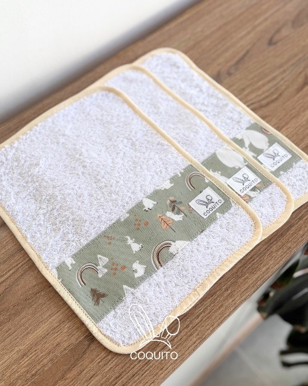 🐰 Tres babitas de tela de toalla 100% algodón y detalles al tono, de una calidad hermosa y súper absorbentes.
