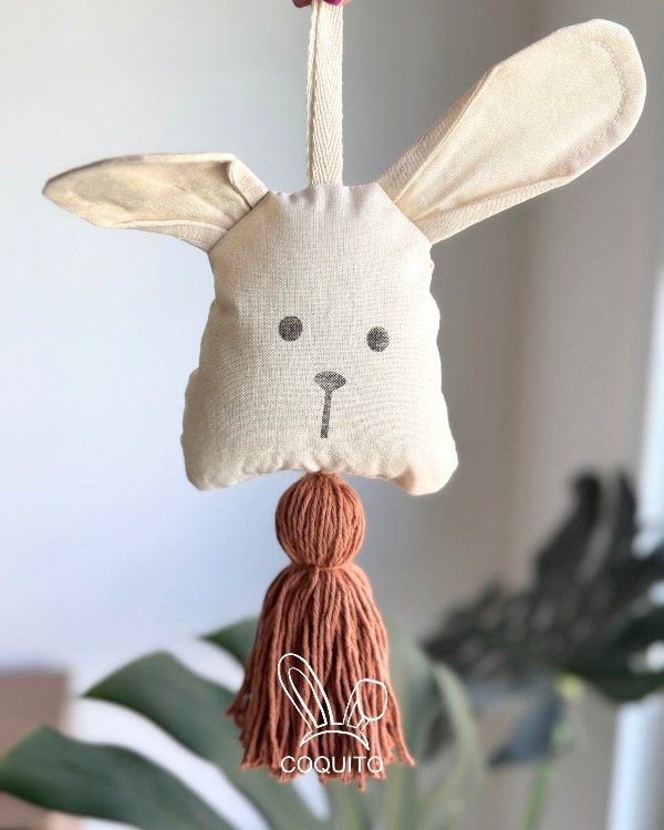 🐰 Nuestro Conejito Coquito Colgante con borla al tono del Kit. Podes usarlo para colgar en el picaportes de la habitación de tu bebé, en los tiradores de una cajonera, en el cochecito, donde quieras!