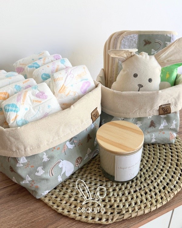 🐰 Dos cestos pañaleros súper espaciosos en gabardina de puro algodón y lienzo, relleno de polar para que no pierda la forma con el tiempo. Medidas Cesto grande: 18x18x18 cm. Medidas cesto mediano: 15x15x15.