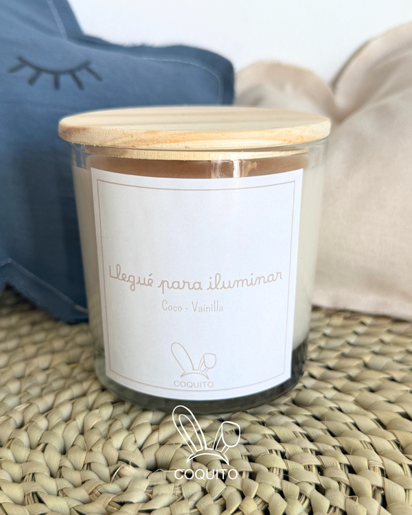 🐰 Vela aromática de soja grande de Coco y Vainilla con tapa de madera y etiqueta: "Llegué para iluminar”. Aroma: Coco y Vainilla.