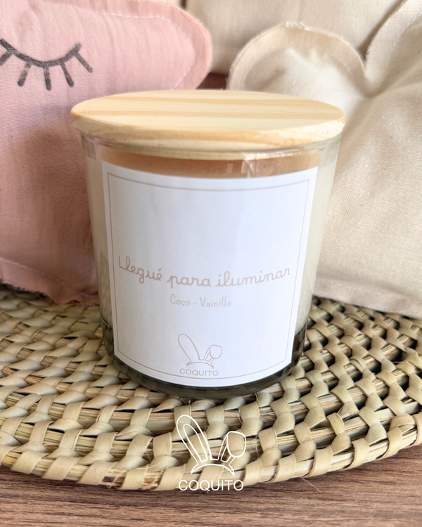 🐰 Vela aromática de soja grande de Coco y Vainilla con tapa de madera y etiqueta: "Llegué para iluminar”. Aroma: Coco y Vainilla.